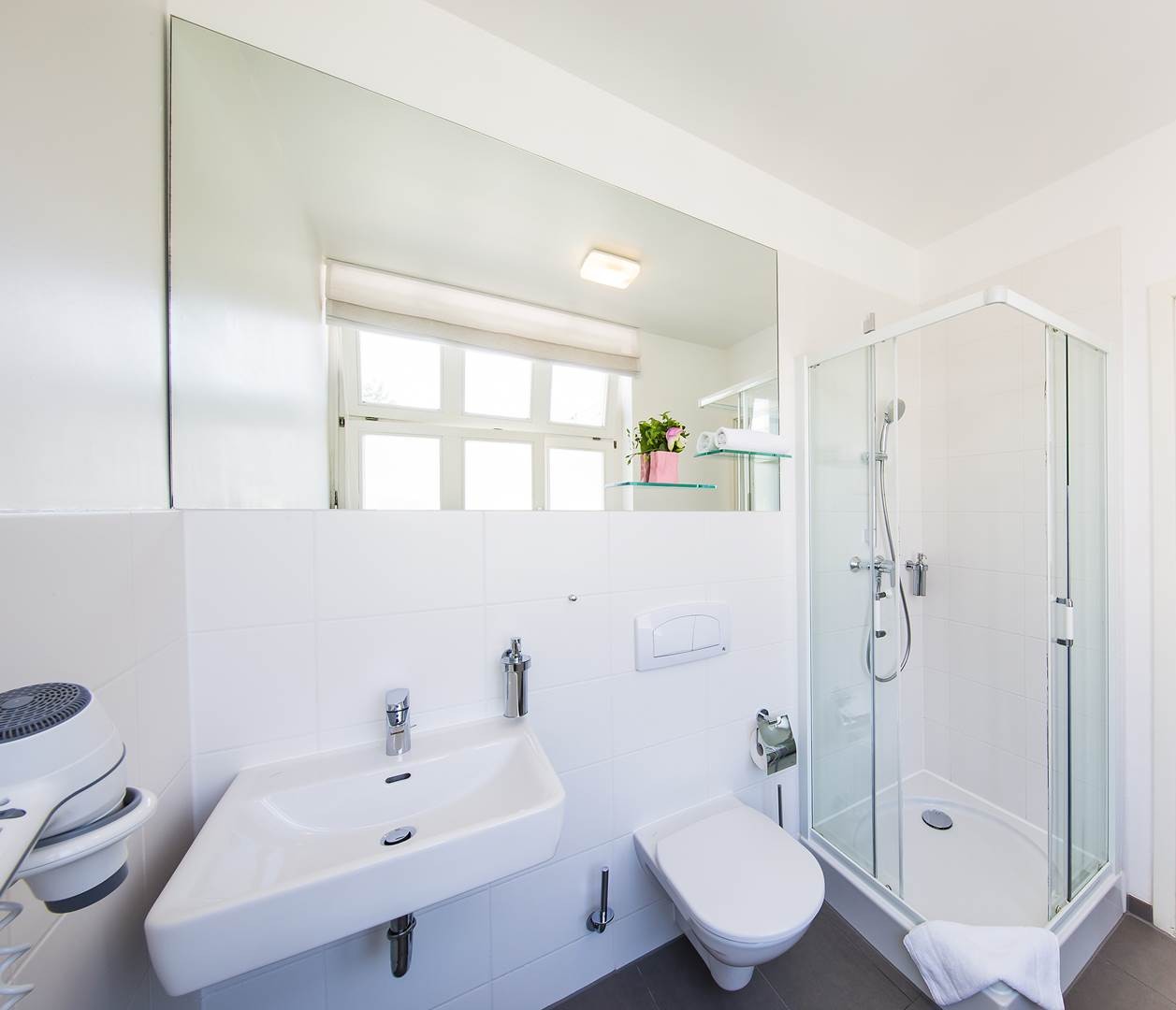 Bathroom with shower / toilet & hairdryer